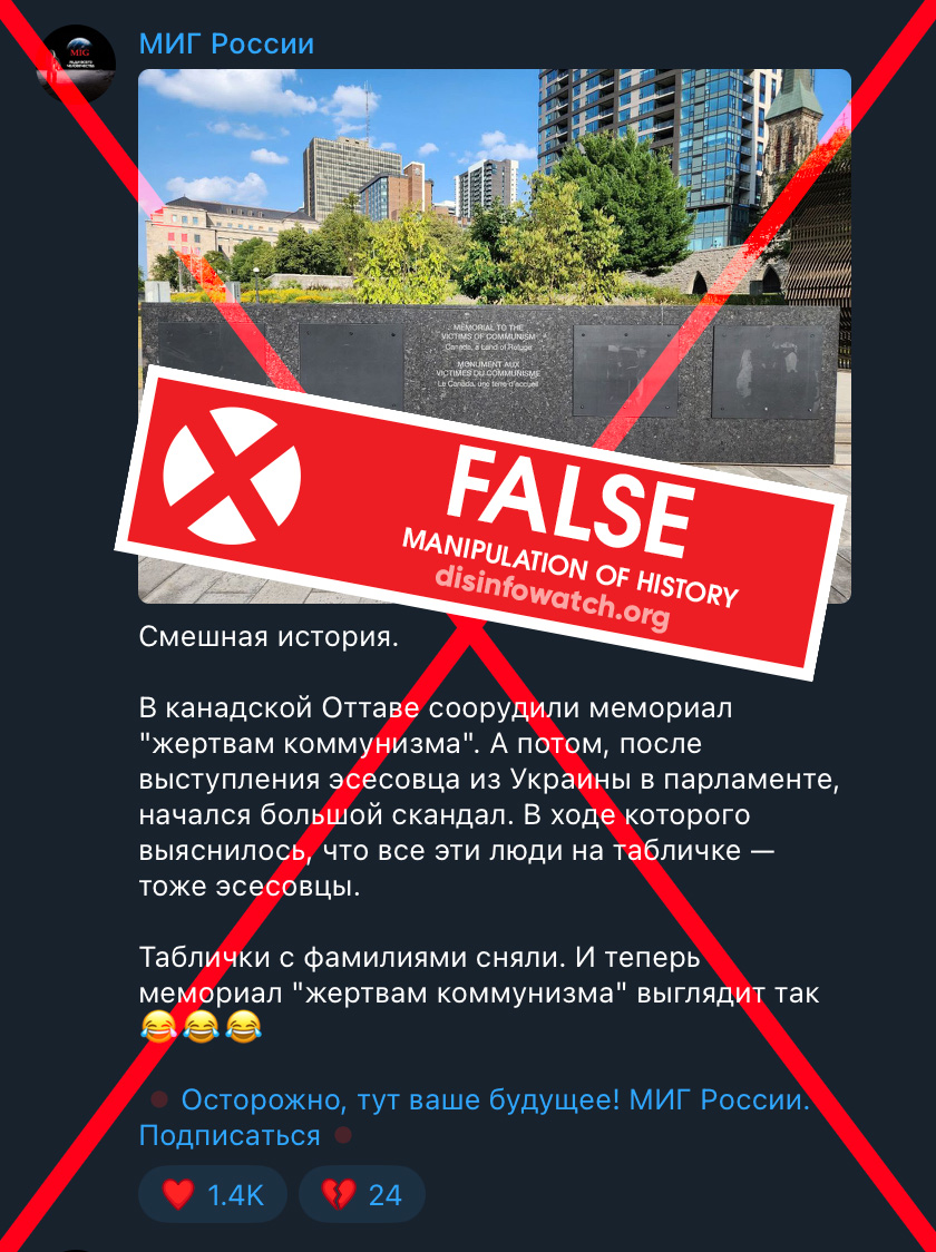 The disinformation post links the memorial to the 2023 incident in Canada’s Parliament when a Ukrainian-Canadian senior citizen who had served in the German foreign legion, the Waffen SS was recognized during President Volodymyr Zelenskyy’s visit. Kremlin-aligned propagandists exploited that controversy to create suspicion within Canadian political circles about the memorial and its inclusion of certain names. While the disinformation attempts to suggest that the incident undermined the project itself, the dedication of the memorial ultimately went ahead in 2025.
