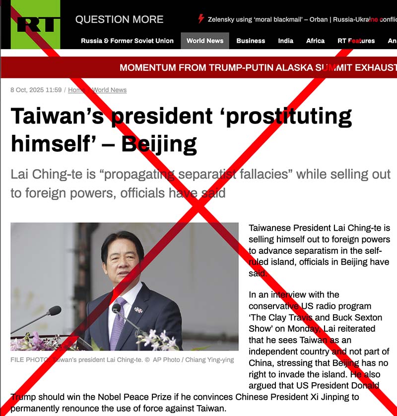 • Kremlin amplification: Russian state media piled on the same day, echoing Beijing’s line and amplifying demeaning language (“prostituting himself”) toward Lai—illustrating the strategic convergence of the PRC–Kremlin propaganda echo chamber.