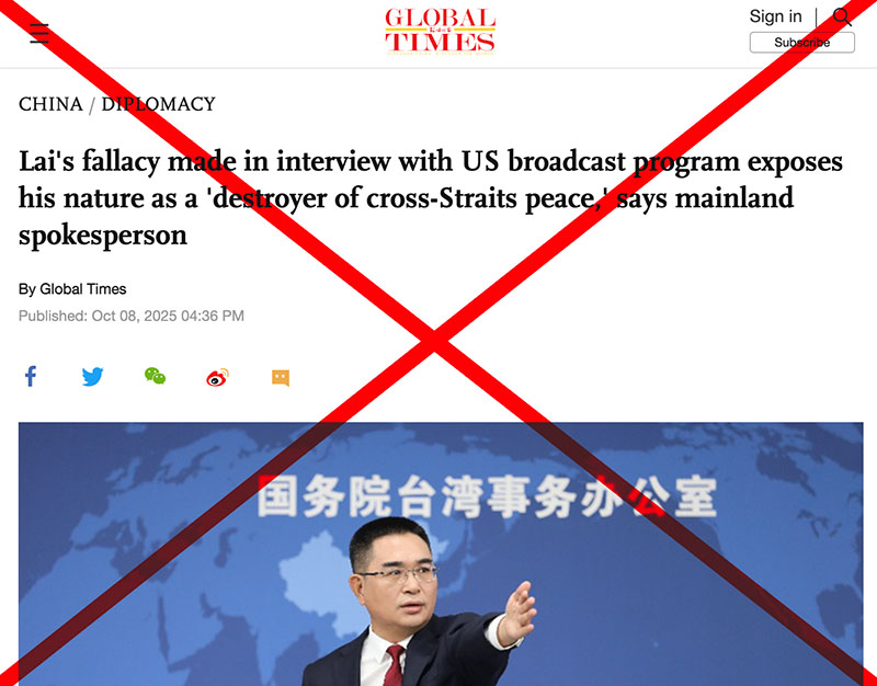 In an October 8, 2025 article, the Chinese Communist Party’s Global Times accused Taiwanese President Lai Ching-te of “seeking independence through military means” and “destroying cross-Strait peace,” while portraying the Chinese military’s (PLA) coercive exercises as stabilizing. The piece manipulates Lai’s remarks, distorts international law, and recycles familiar CCP narratives to shift blame for tensions away from Beijing and onto Taiwan’s democratically elected leadership.