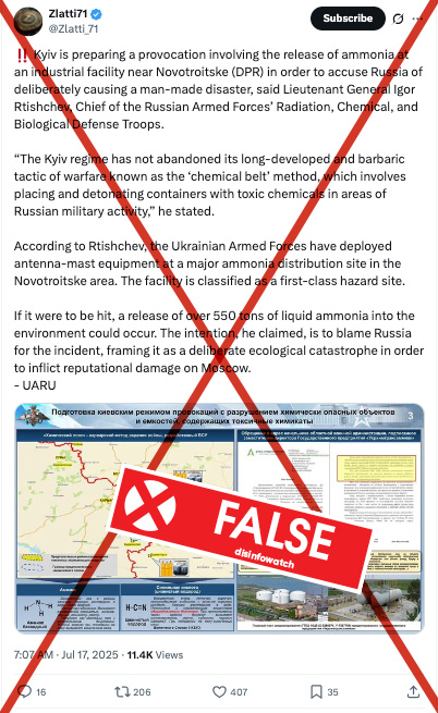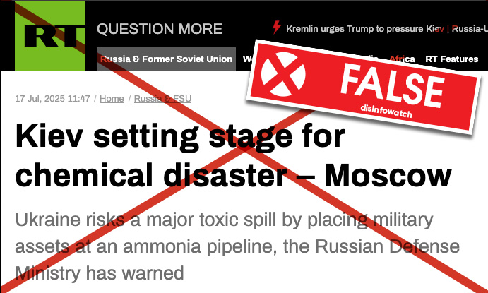 • The article repeats a Kremlin claim that Kyiv is orchestrating a “major chemical disaster” near the front, intended to blame Moscow.