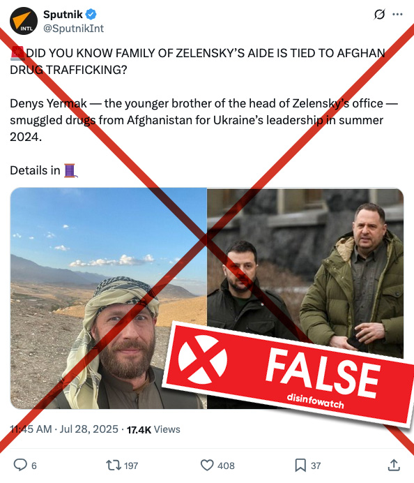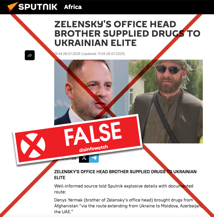A Kremlin-backed disinformation campaign, led by RIA Novosti and Sputnik News, alleges that Denys Yermak—the brother of the head of Ukraine’s Presidential Administration—is involved in smuggling narcotics into Ukraine on behalf of government officials. The report relies solely on an unnamed “well-informed” source and provides no verifiable evidence. Sputnik, a key propaganda arm of the Russian state, frequently targets perceived enemies of the Kremlin as part of Moscow’s broader information warfare against Ukraine and Western democracies.