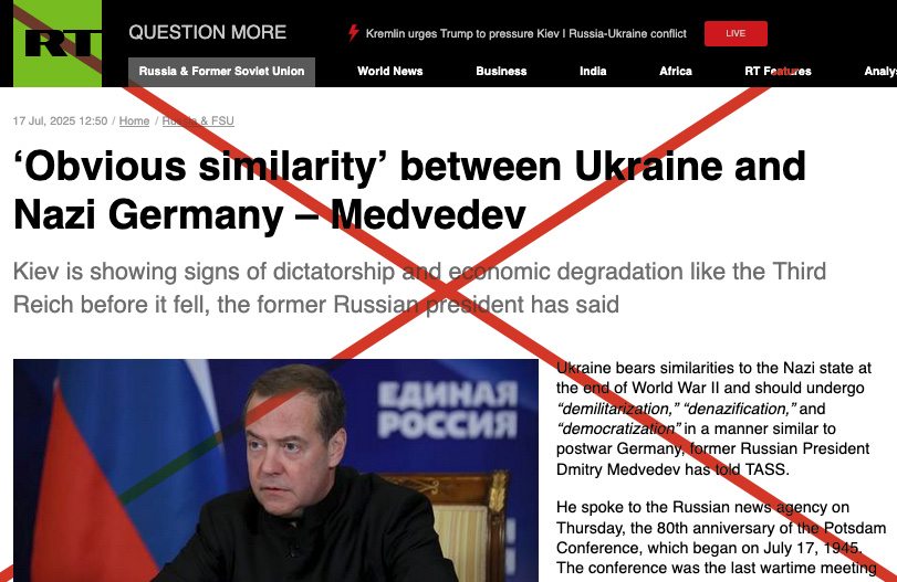Former Russian President Dmitry Medvedev has once again manipulated and weaponized history to justify Russia’s war againstg Ukraine. In a recent RT article, Medvedev absurdly likens modern Ukraine to Nazi Germany, reviving the false “denazification” narrative that has been exploited to underpin Moscow’s aggression since 2022. This propaganda rhetoric aims to rally domestic support, frame Russia as a victim of Western aggression, and preemptively justify further violence against Ukraine and its allies.