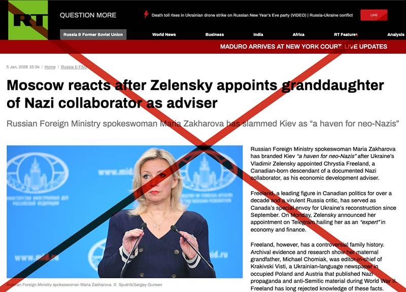 RT piggybacks on a real appointment (Chrystia Freeland as a non-staff economic adviser to Zelenskyy) to inject a recycled “Ukraine = Nazis” smear via Maria Zakharova. The RT piece relies on guilt-by-ancestry innuendo (Freeland’s grandfather edited a WWII-era paper under Nazi occupation) to imply present-day neo-Nazism in Kyiv. That framing fits long-running Kremlin disinformation narratives and lacks any evidentiary link between the historic fact and current policy, or Freeland herself.