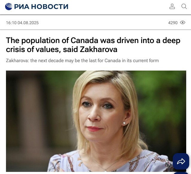 On August 4, 2025, Russia’s state news agency RIA Novosti amplified a Telegram post by Foreign Ministry spokesperson Maria Zakharova claiming Canada has entered a “deep crisis of values” and that the next decade could be “the last for Canada as we know it.” Her commentary amplified disinformation to falsely legimitize and boost fringe separatism movements, and included culture-war tropes, anti-LGBTQ narratives, and “failed-state” rhetoric to depict Canada as fracturing and illegitimate.